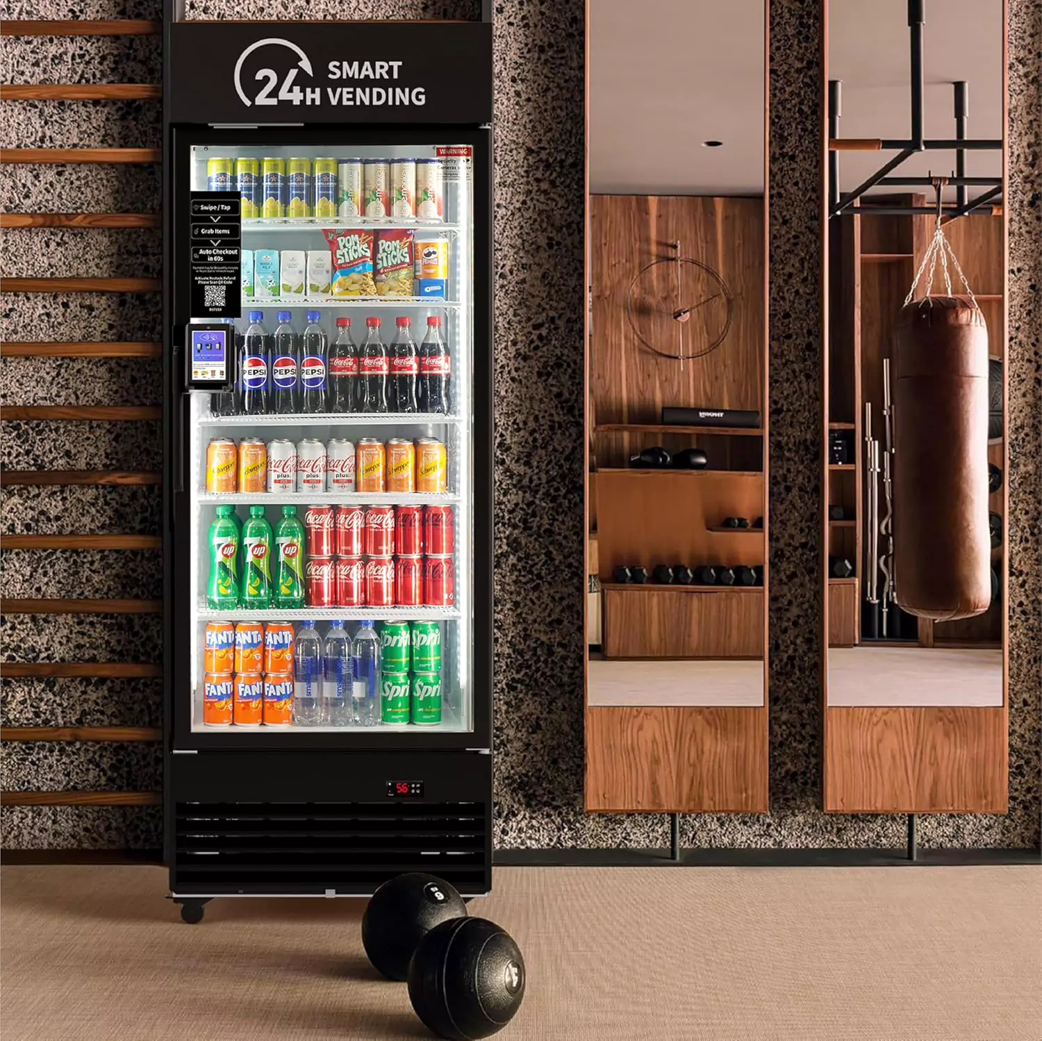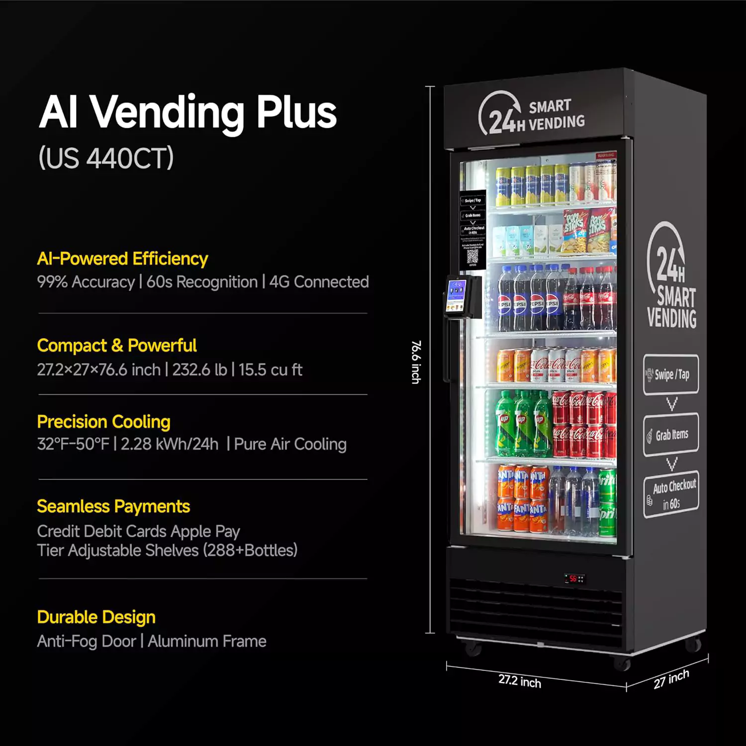 This model is a AI operated cashless smart device, designed for snacks, fresh food, drinks, beverages and even medical supplies. The customer simply inserts a debit/credit card in the payment terminal and gets charged after the door is closed (similar to grab and go stores). The purchase of the cooler comes with a pre-installed touchscreen payment terminal powered by PAX USA